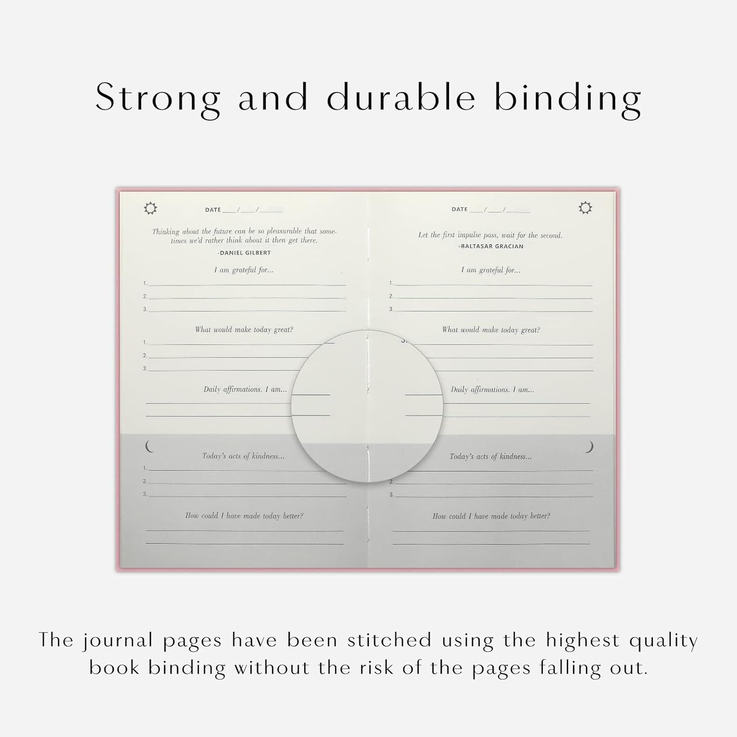 The journal includes 192 guided pages (for 192 days of gratitude) and 6 additional note pages, with no pre-dated entries — so you can write freely, skip a day without guilt, and never waste a page. Its A5 size makes it perfect to carry anywhere — in your handbag, backpack, or car — so gratitude can always travel with you. With hardcover binding, sewn (not glued) pages, and a 180° lay-flat design, it’s comfortable for both left- and right-handed writers. The built-in ribbon bookmark makes it easy to pick up exactly where you left off.